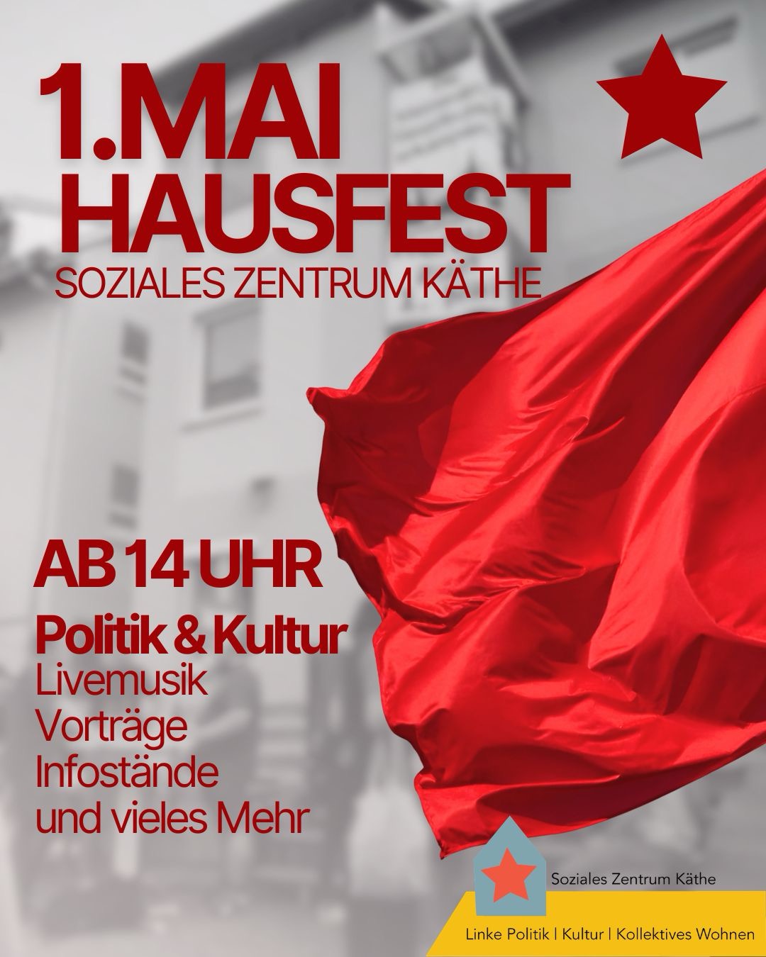 Nach der 1. Mai Demo in Heilbronn findet ab 14 Uhr im Sozialen Zentrum Käthe unser 1. Mai Fest statt. Wir freuen uns an diesem Tag die Türen unseres Zentrums zu öffnen und bei hoffentlich gutem Wetter gemeinsam den Arbeiter*innenkampftag zu feiern. 🚩